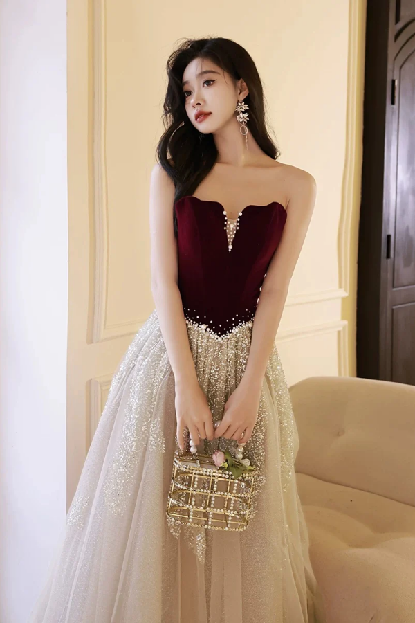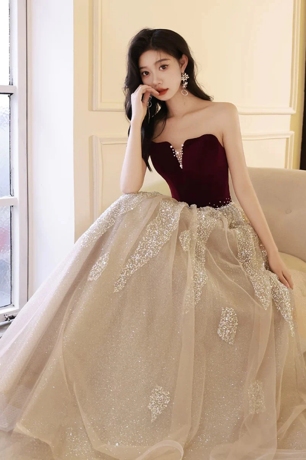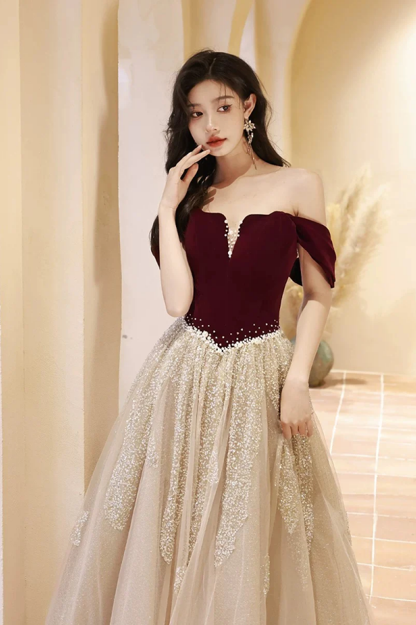 A Line Off Shoulder Tulle Velvet Floor Length Champagne Prom Dress With Sequin KPP2273