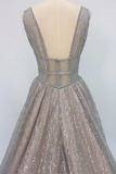 Shiny V Neck Open Back Champagne Long Prom Dresses, Formal Graduation Dress KPP1739