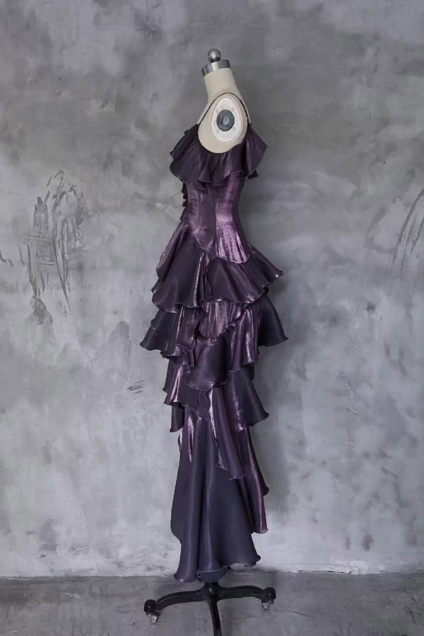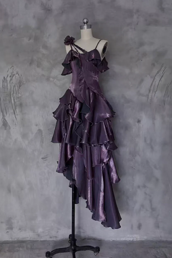 A Line Off Shoulder Silk Irregular Ruffles Purple Prom Dress KPP2361