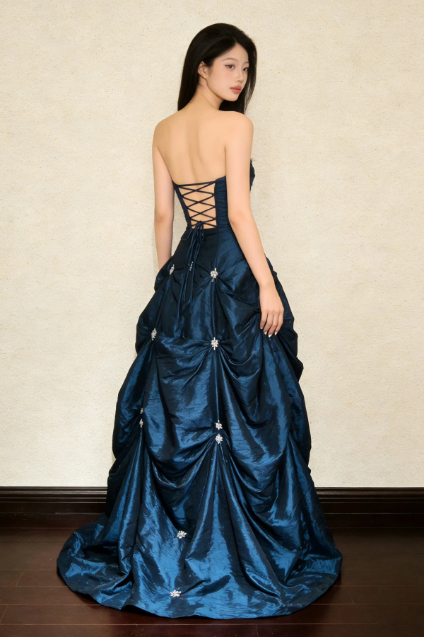 A Line Sweetheart Neck Irregular Taffeta Dark Blue Long Prom Dress KPP2343