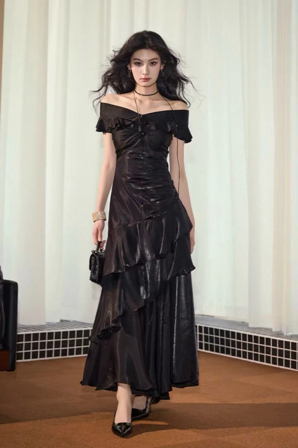 A Line V Neck off Shoulder Silk Ruffles Black Prom Dress KPP2336