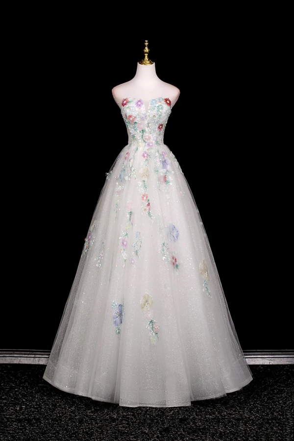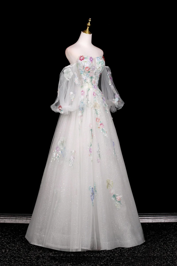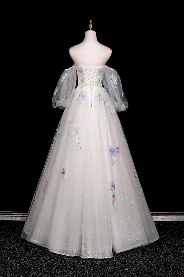 Beautiful Tulle Sequins Long Prom Dress, White Off the Shoulder Formal Dress KPP2231