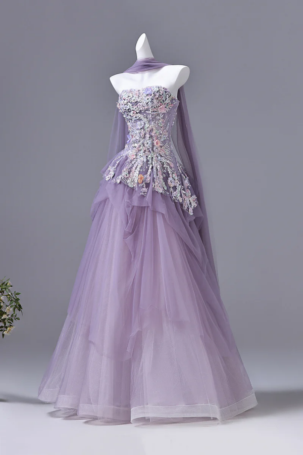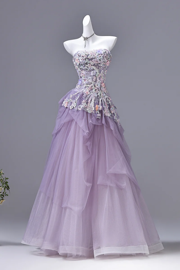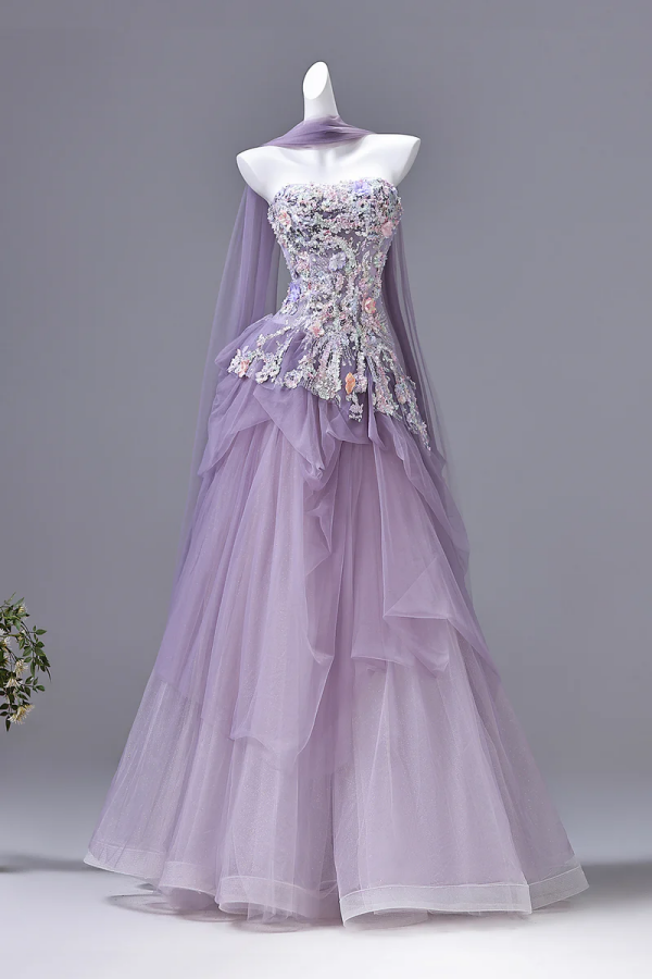 Lavender Purple Strapless Floral Beaded Prom Gown, Tulle Evening Dress with Drape KPP2342