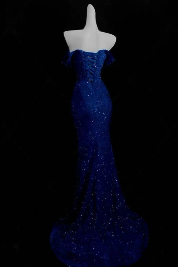 Mermaid Off Shoulder Velvet Sequin Blue Long Prom Dress KPP2345