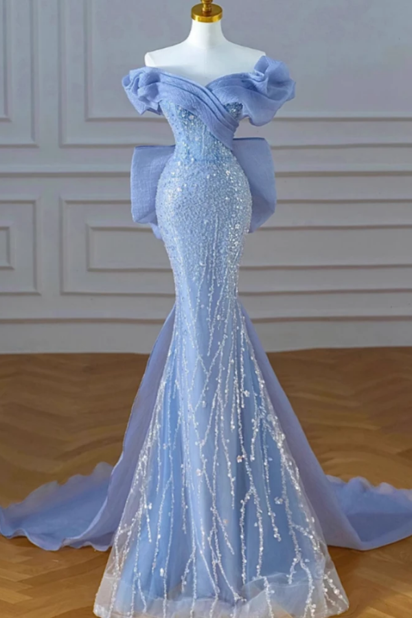 Sexy Blue Mermaid Tulle Sequins Off the Shoulder Prom Dress KPP2359
