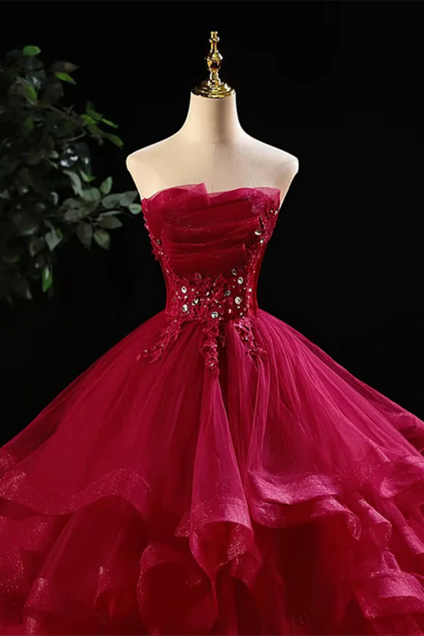 Wine Red Tulle A Line Floor Length Prom Dress, Beaded Long Evening Party Dress KPP2249