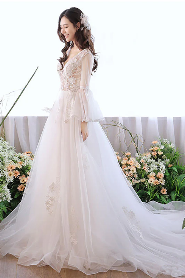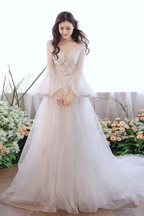 White V Neck Tulle Lace Long Prom Dress, White Evening Dress KPW0751