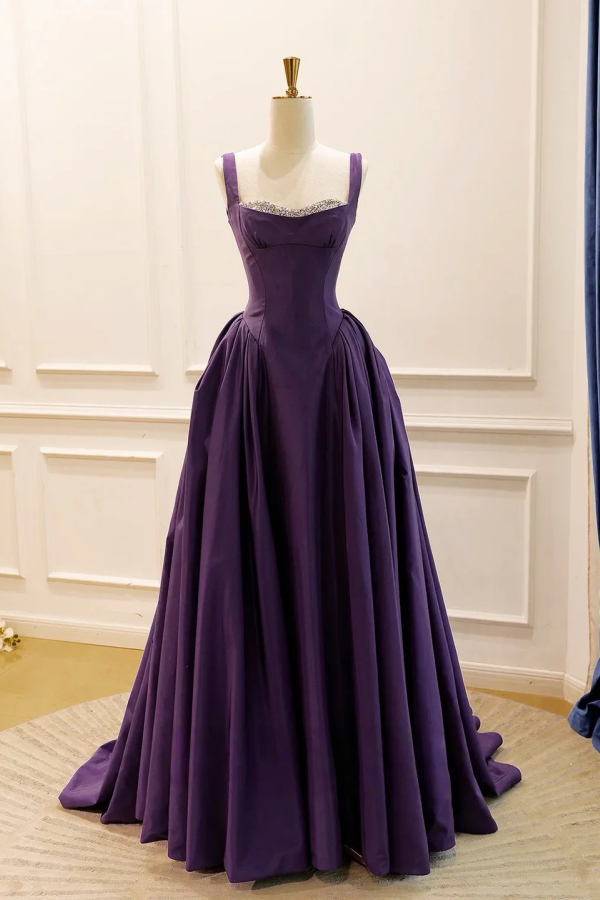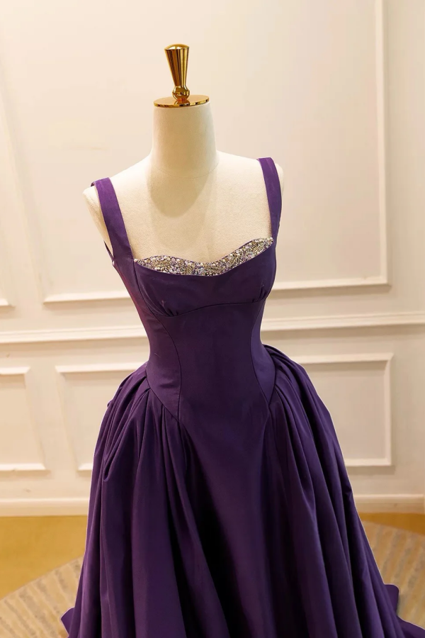 A Line Sweetheart Neck Sweep Floor Satin Purple Long Prom Dress with Beads KPP2297