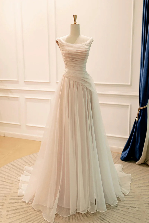 Draped Off Shoulder Tulle Prom Dress, Champagne Floor Length Party Gown with Train KPP2288