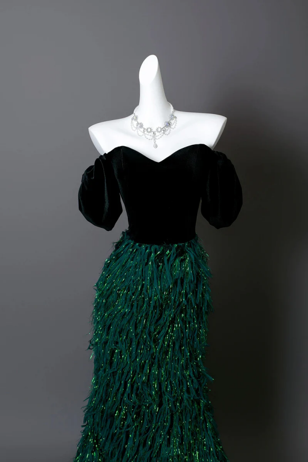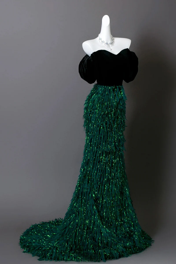 Sparkly Emerald Green Fringe Prom Gown, Off Shoulder Velvet Sweetheart Neckline Mermaid Dress KPP2300