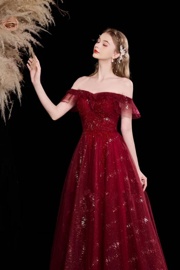 Wine Red Tulle Off Shoulder Sweetheart Party Dress, A Line Long Prom Dress KPP2279