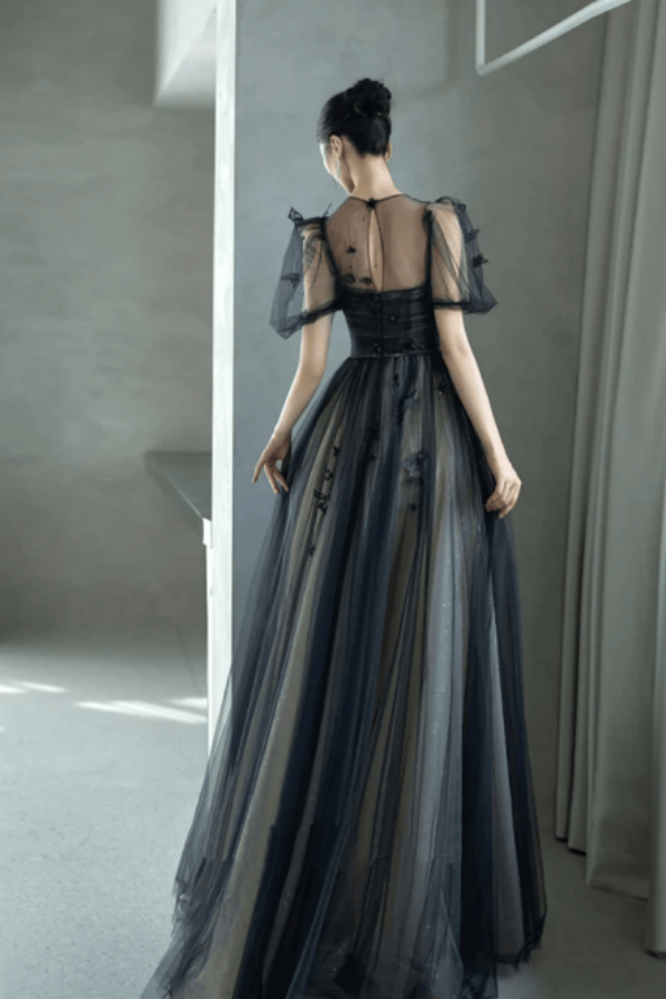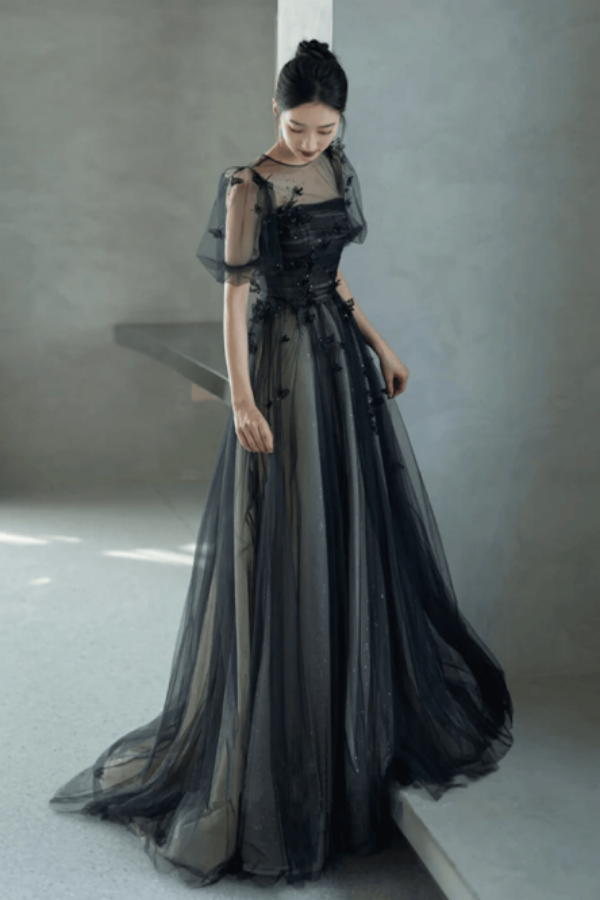 Black A Line Tulle with Lace Long Party Dress, Black Tulle Prom Dress KPP1835
