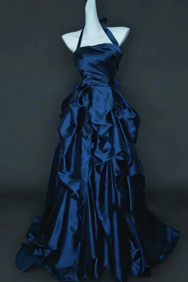 Elegant Navy Blue Taffeta Ruffled Prom Dress, Halter Party Evening Dress KPP2305