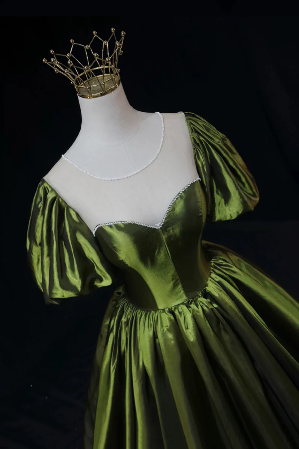 Olive Green Satin Ball Gown with Puff Sleeves, Princess Prom Dress KPP2311