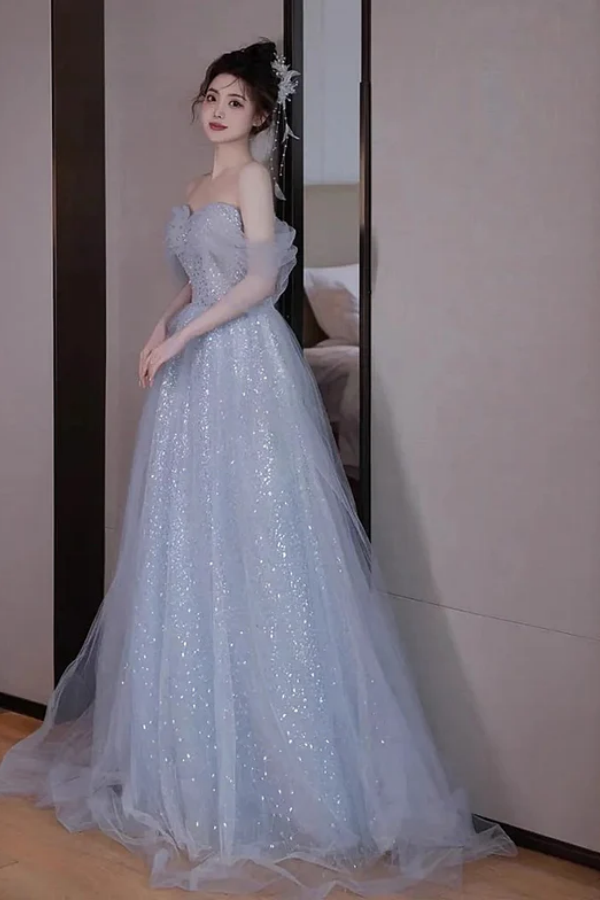Light Blue Tulle and Sequins Off Shoulder Party Dress, Floor Length Prom Dress KPP2252