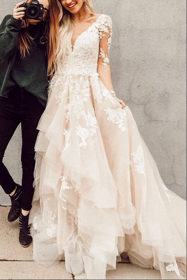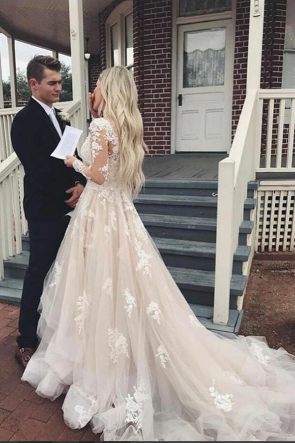 Kateprom Gorgeous Lace A line V neck Long Sleeves Wedding Dresses with Train KPW0680