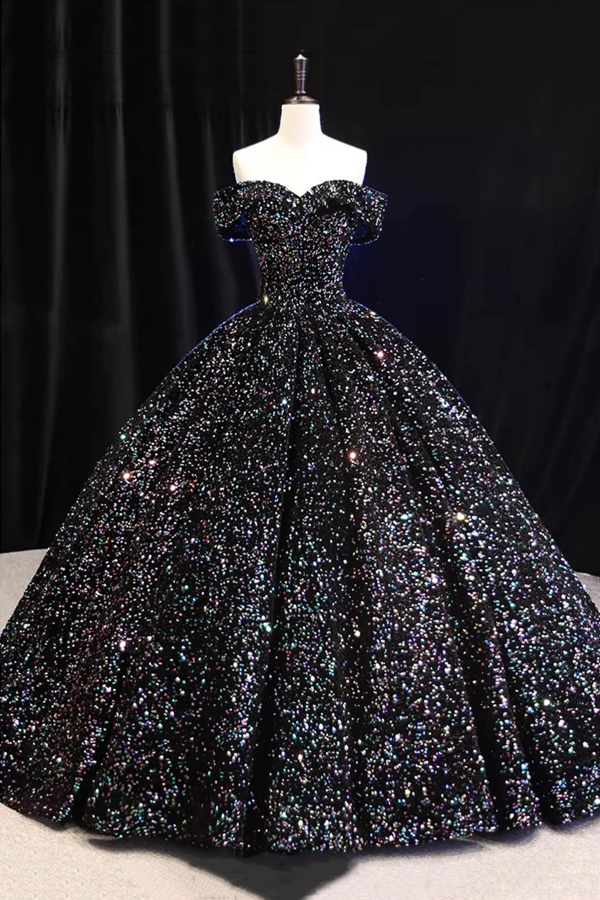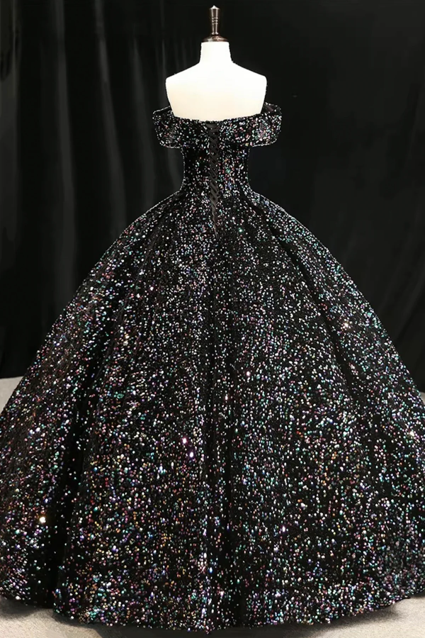 Glitter Black Princess Prom Dress, Off Shoulder Floor Length Ball Gown KPP2319
