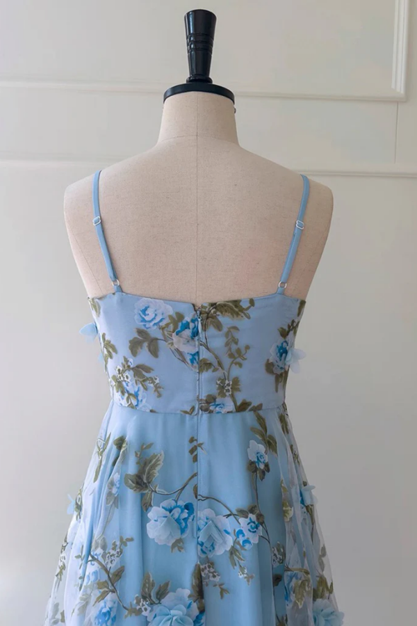 Simple A Line Tulle 3D Flower Blue Long Prom Dress, Blue Party Dress KPP2222