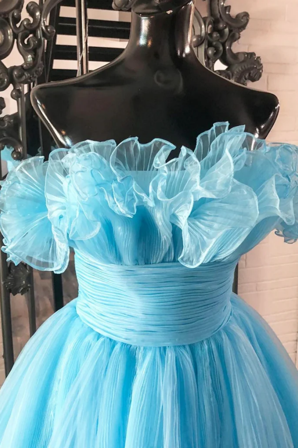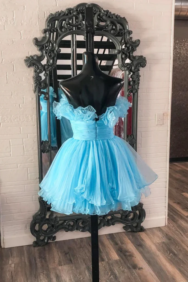 Strapless Short Pleated Blue Ruffle Tiered Prom Dresses, Homecoming Dresses KPH0797