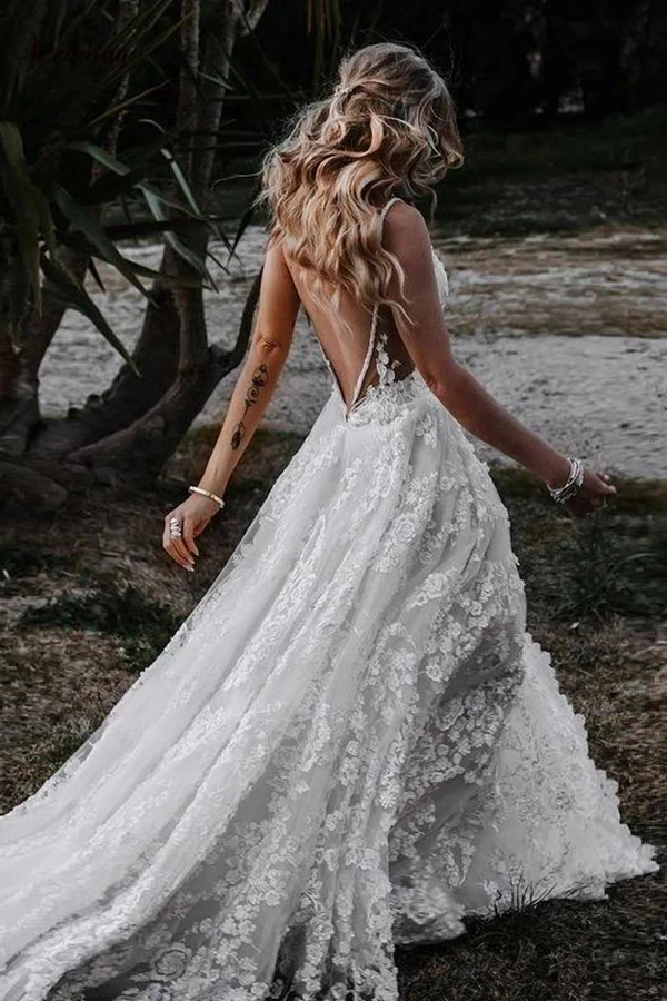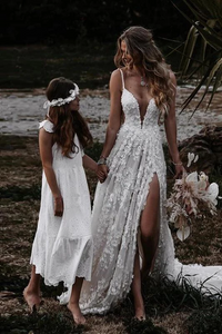 Kateprom Deep V Neck A Line Lace Wedding Dresses With Slit, Spaghetti Straps Long Bridal Gowns KPW0697