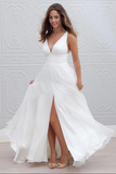 Kateprom Deep V Neck Side Slit Wedding Dresses,Simple V Back Beach Wedding Gown KPW0704