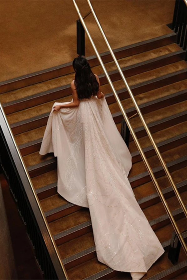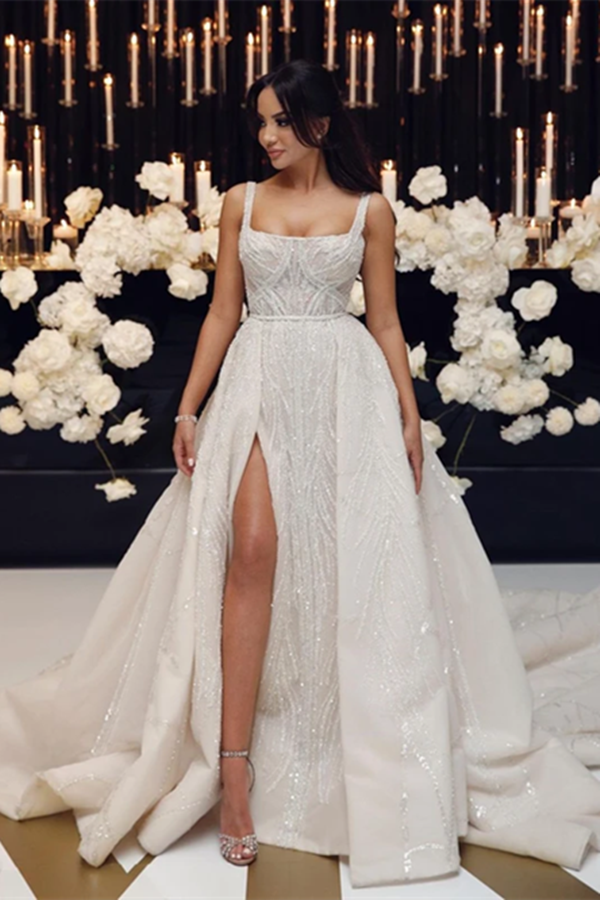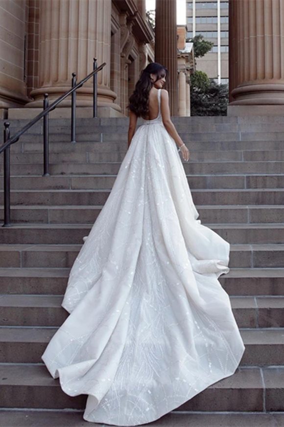 Kateprom Gorgeous Beaded Lace Spaghetti Straps A line Chapel Train Wedding Dresses KPW0696