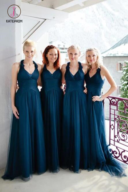 A-Line V-Neck Long Ruched Tulle Bridesmaid Dress, Cheap Halter Long Bridesmaid Dress KPB0173