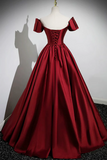A Line Burgundy Satin Floor Length Prom Dress, Off the Shoulder New Party Dress KPP1790