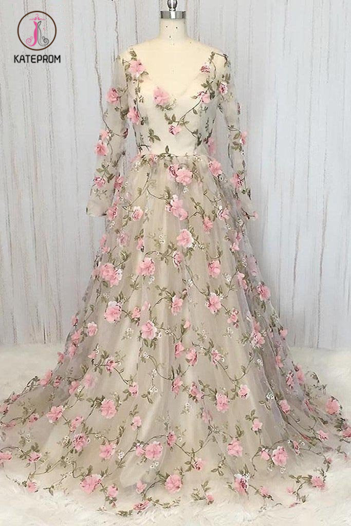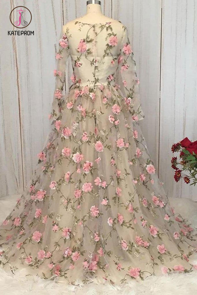 A Line Lace Long Sleeve Formal Dress, Cheap Prom Dress with Lace Flowers KPP0520