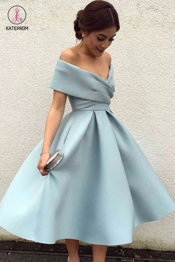 A-Line Off-the-Shoulder Tea-Length Sleeveless Homecoming Dress,Light Blue Satin Prom Dress KPH0160