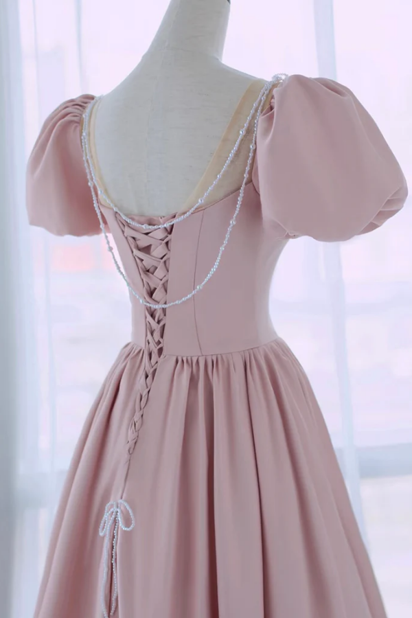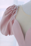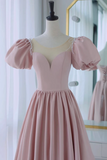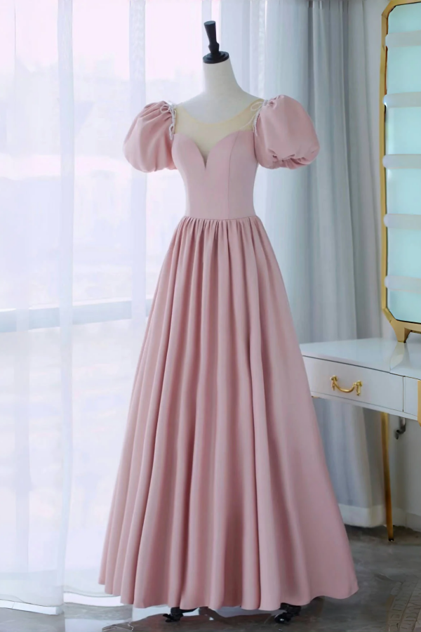 A Line Puff Sleeves Satin Pink Long Prom Dress, Pink Long Formal Dress KPP2187