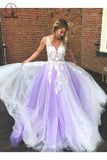 A-Line Purple Tulle V-neck Floor Length Prom Dress with White Appliques KPP0773