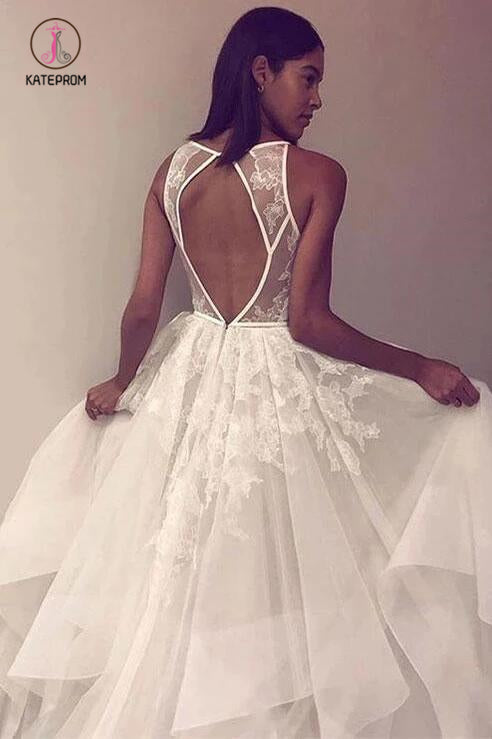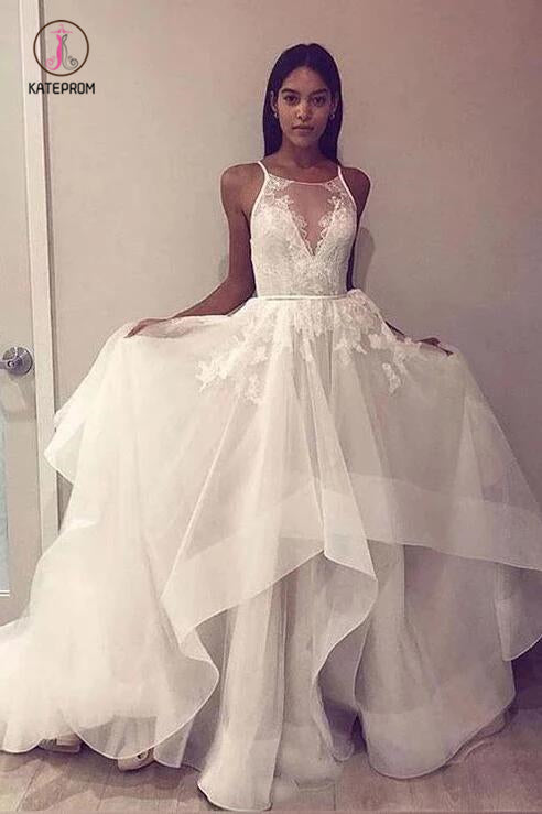 A Line Sleeveless Tulle Prom Dress with Lace Appliques, Cheap Beach Wedding Dress KPW0540