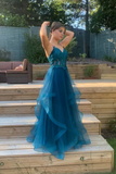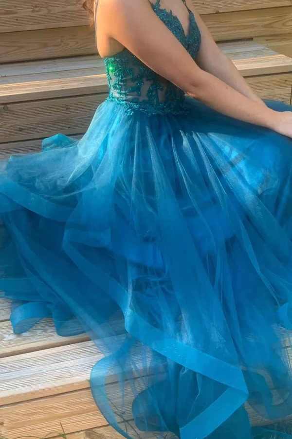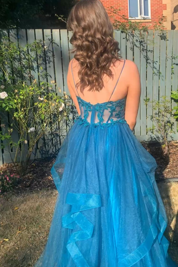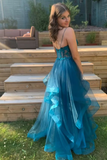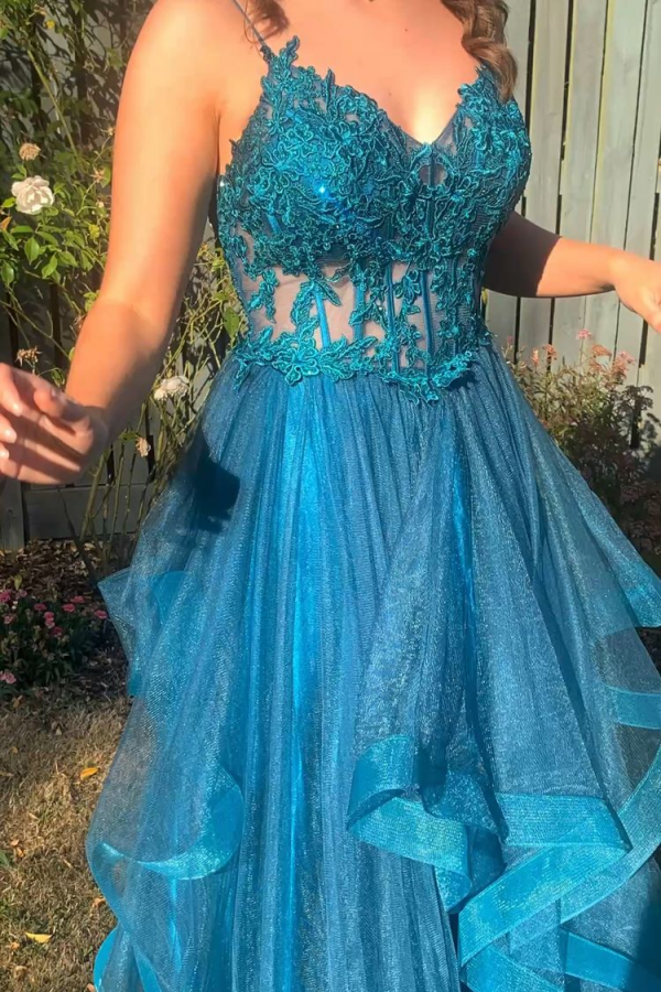 A Line Spaghetti Straps V Neck Tulle Lace Long Prom Dress Formal Dress KPP1890