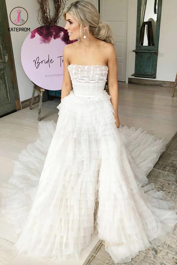A-Line Strapless Tiered Court Train Ivory Tulle Wedding Dress, Beach Wedding Dress KPW0315