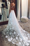 A Line White Straps Long Split V Neck Lace Beach Wedding Dress, Lace Bridal Dress KPW0136