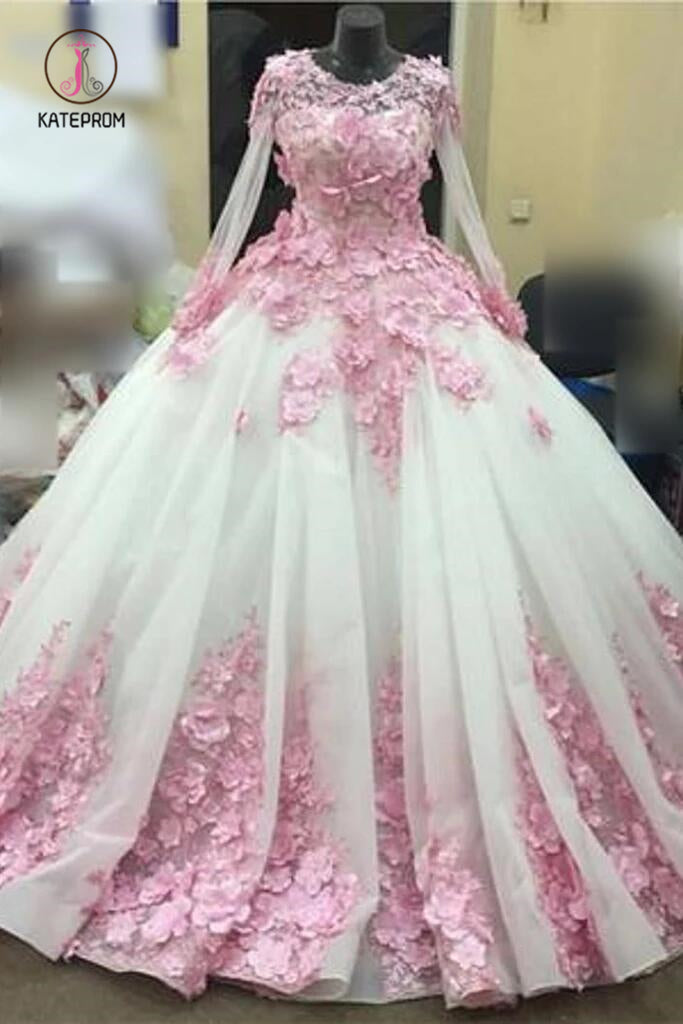 Ball Gown New Style Long Sleeve Tulle Prom Dress with Pink Flowers, Ivory Wedding Dress KPW0284