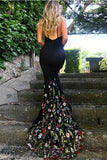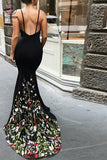 Black Mermaid Prom Dress, Spaghetti Strap Sleeveless Evening Dress with Lace Flowers KPP0667