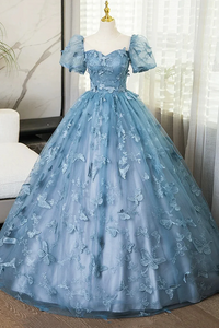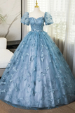 Blue Short Sleeves Long Party Dress with Butterfly Lace, Blue Prom Dress KPP2009