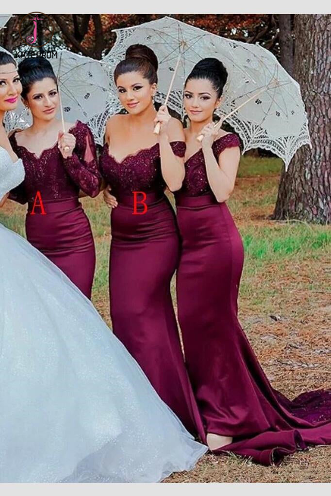 Burgundy Mermaid Long Sleeves Sweep Train Lace Bridesmaid Dress KPB0120