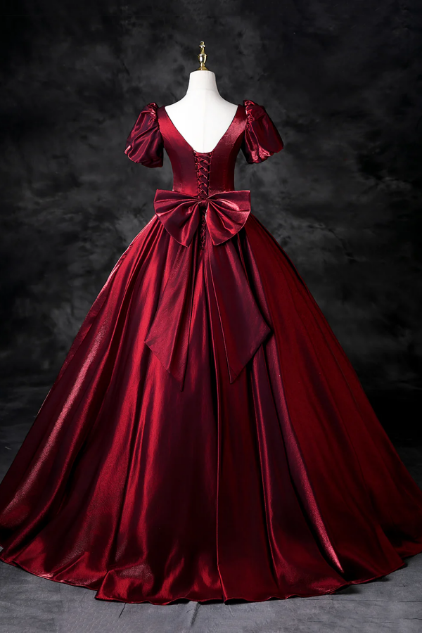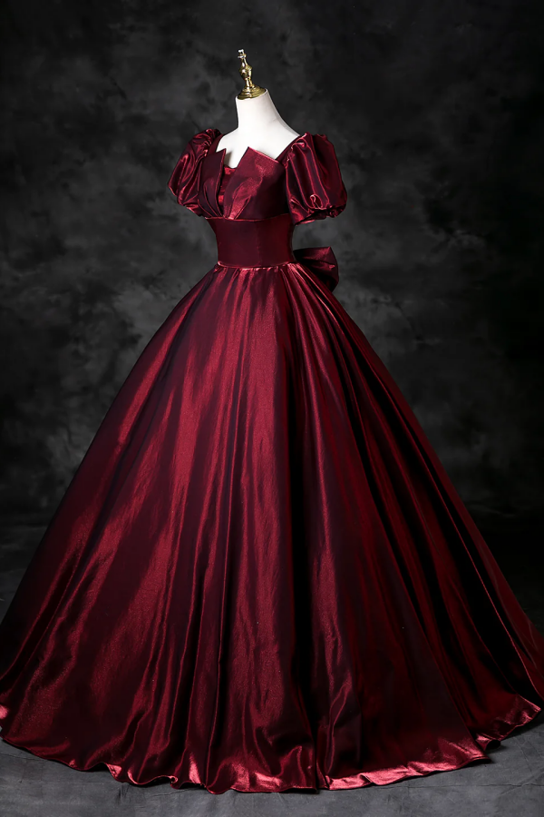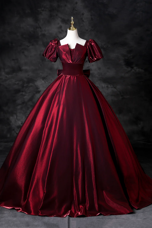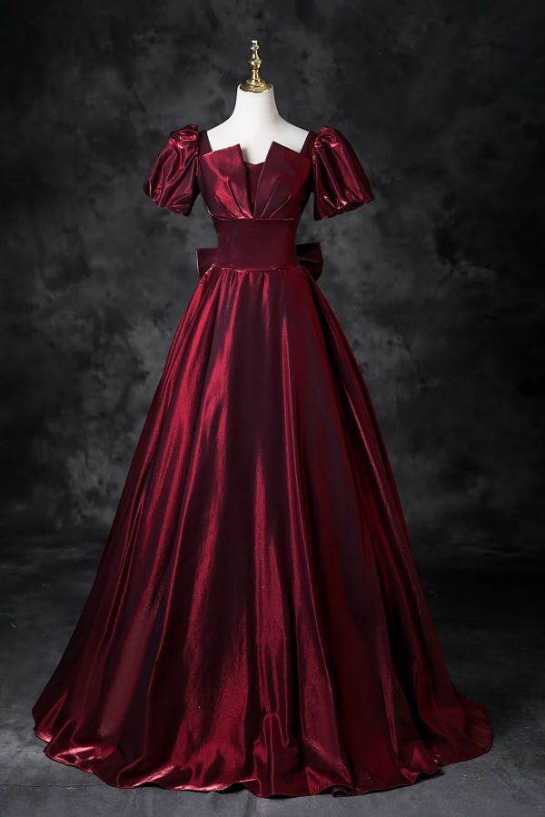 Burgundy Satin Floor Length Prom Dress, A Line Short Sleeve Formal Dress KPP2128