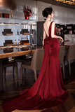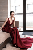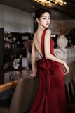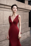 Burgundy V Neck Satin Long Prom Dress, Elegant Backless Evening Party Dress KPP1862