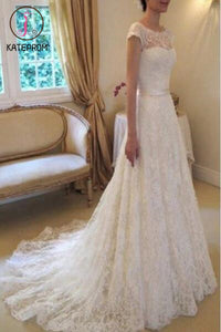 Cap Sleeve Lace Wedding Dresses,Long Bridal Dresses With Court Train,Ivory Beach Wedding Dress KPW0048