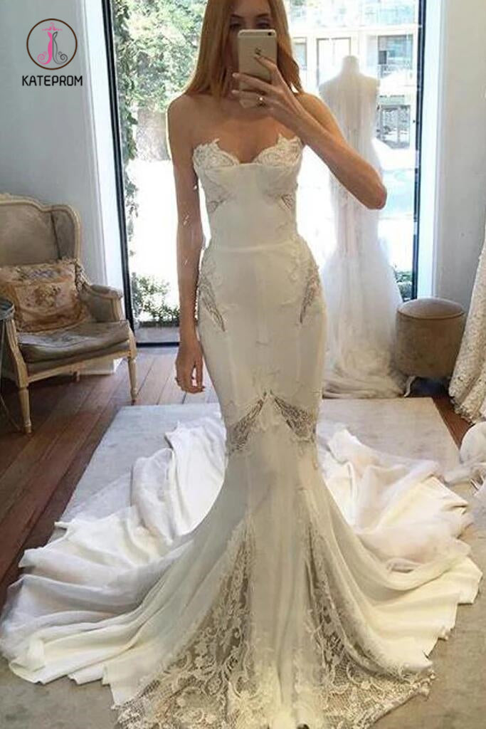 Chapel Train Sweetheart Mermaid Lace Appliques Chiffon Wedding Dress KPW0358