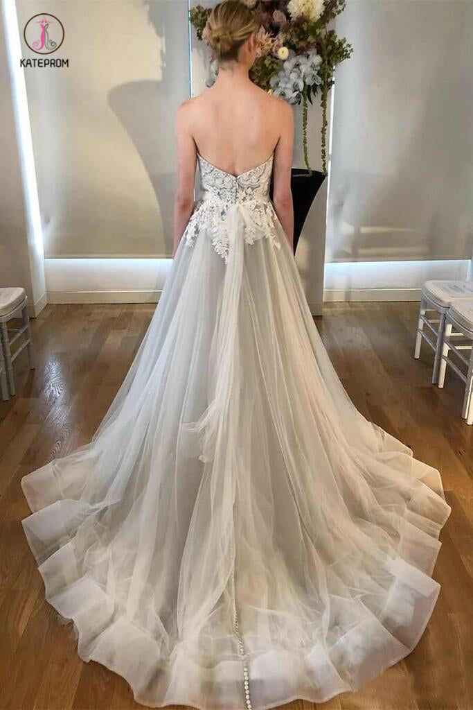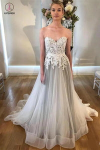 Cheap Sweetheart Neck A Line Silver Grey Wedding Dresses, Long Appliqued Bridal Dress KPW0272