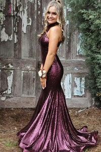 Glitter Sequin High Neck Mermaid Prom Dresses, Purple Evening Dress with Train KPP0761