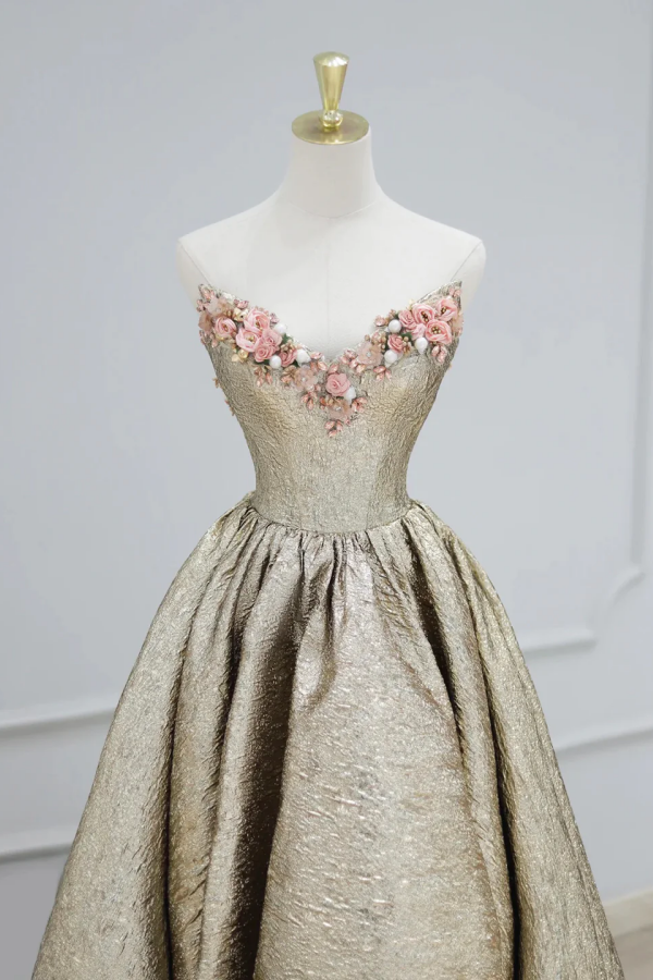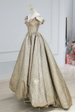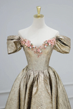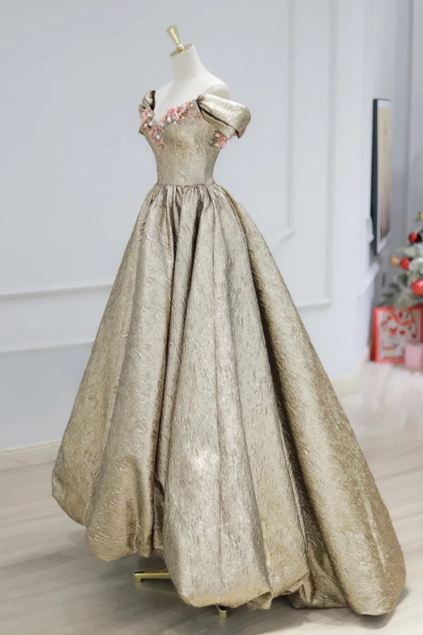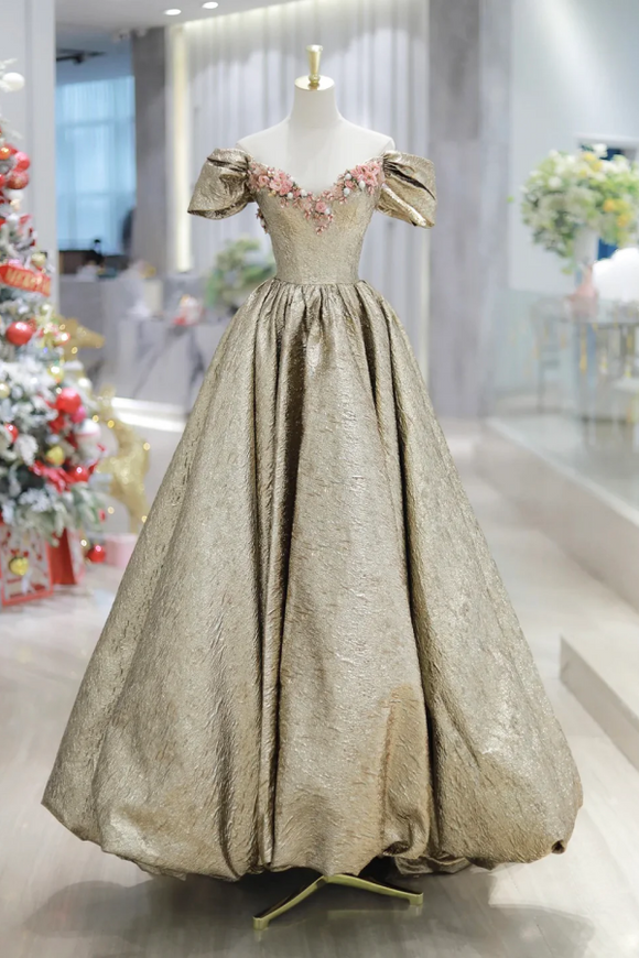 Gold Satin V Neck Long Prom Dress with Flowers, Off the Shoulder A Line Formal Dress KPP1924