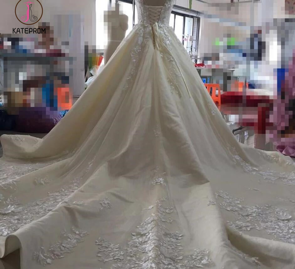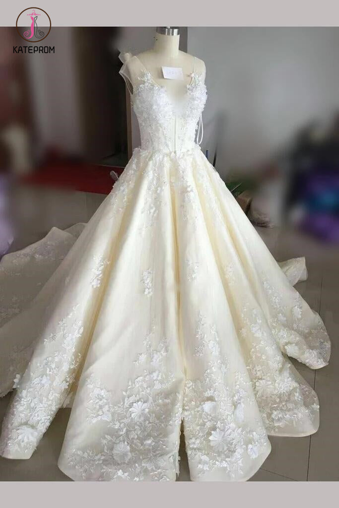 Gorgeous Beige V-neck Court Train Ruched Satin Prom Dress with Flowers,Bridal Dress KPW0118