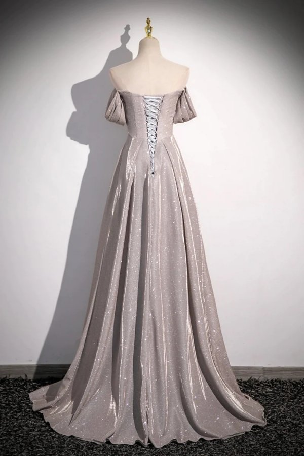 Grey Sequins Ruffle Long Party Dress, Off the Shoulder Short Sleeve Sweep Train Evening Dress KPP1900