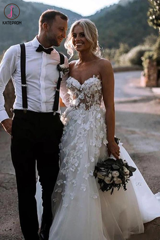 Hot Selling Sweetheart Wedding Dress with Flowers, A Line Tulle Wedding Dress with Appliques KPW0582